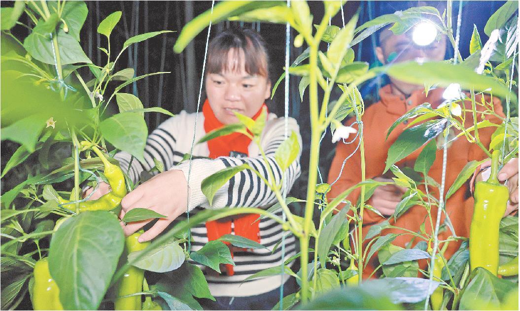 2月7日晚,耿红妍和丈夫到大棚里抢摘辣椒,为第二天的村晚留出时间。