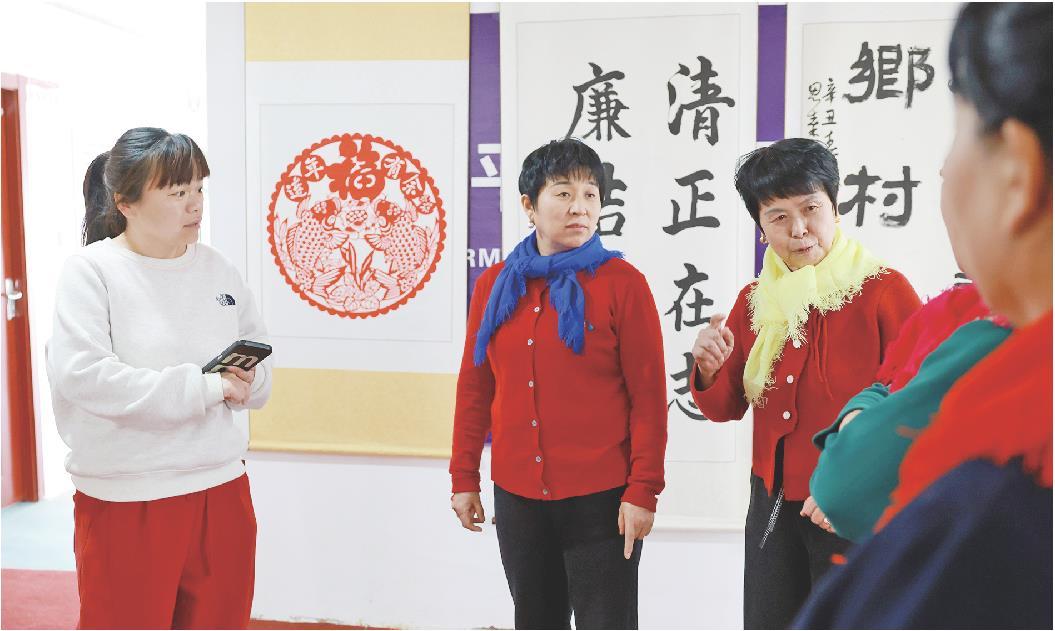 2月5日,耿红妍(左一)和村民在贾寨镇综合文化站排练节目,排练多次依然衔接不好,村民们眉头紧锁,探讨解决办法。