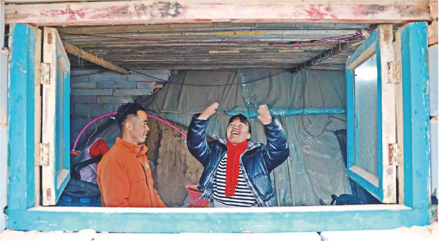 2月6日,耿付达(左)和耿红妍在劳动之余排练朗诵节目,耿红妍为丈夫提出建议。