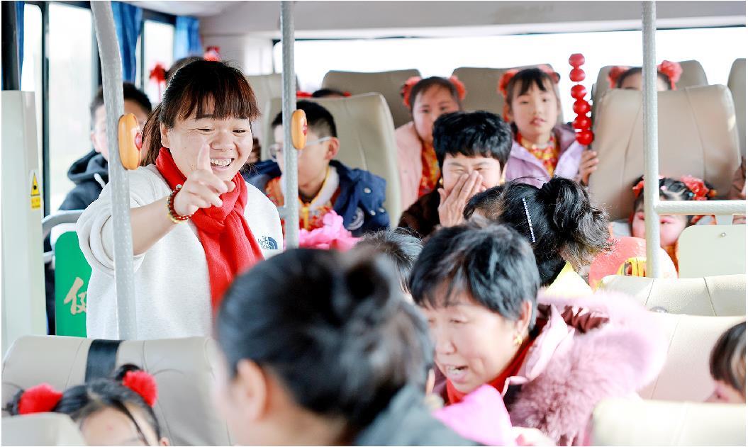 2月5日,耿红妍(左一)带队参加茌平区春晚彩排,在车上和大家强调注意事项。