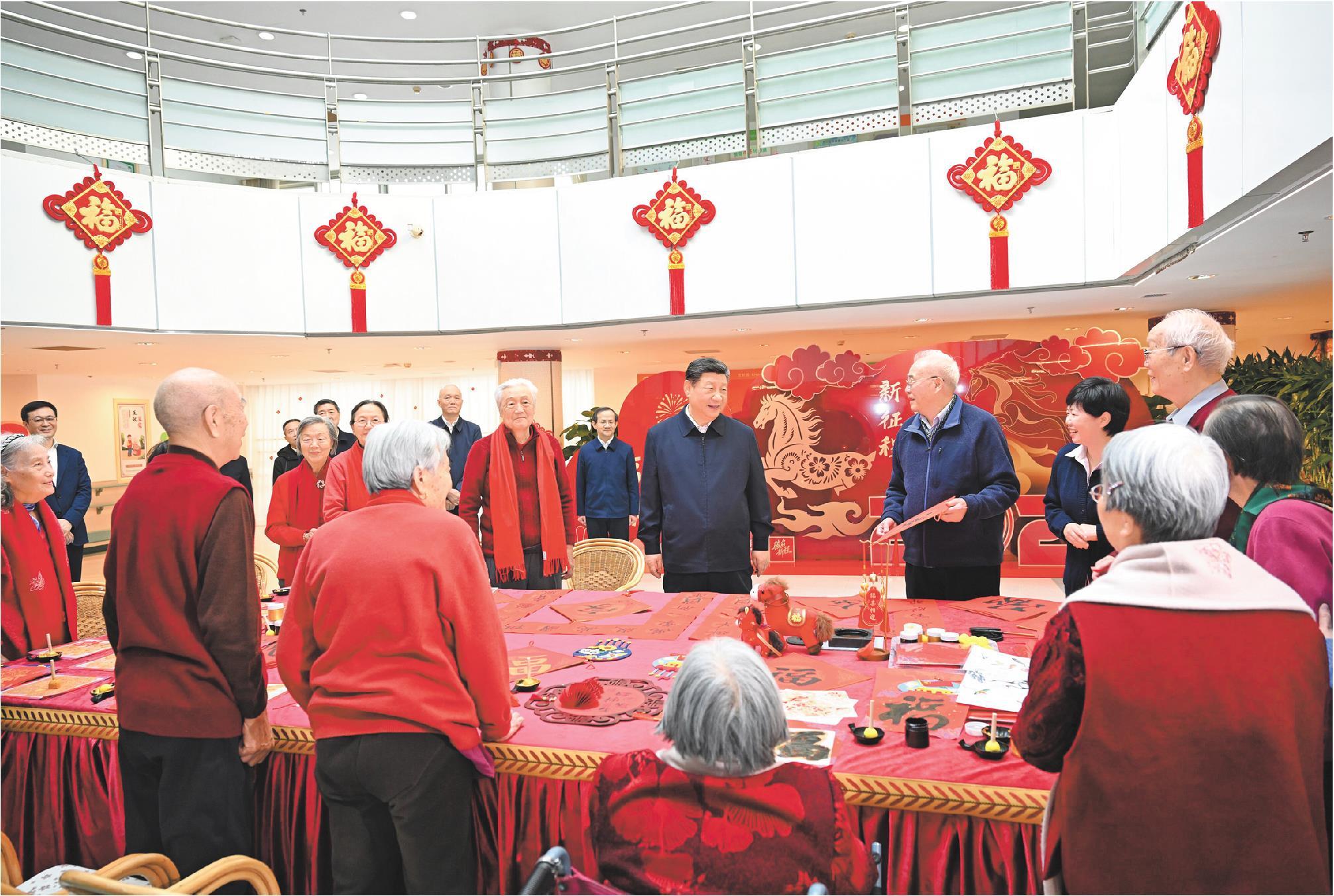 在银龄老年公寓,习近平详细了解老年人健康检查、康复训练、日常起居照料等情况。大厅里,一些老人正在写春联和福字,习近平来到他们中间,欣赏他们的创作,勉励他们老骥伏枥、老有所为,祝他们健康长寿、春节快乐。