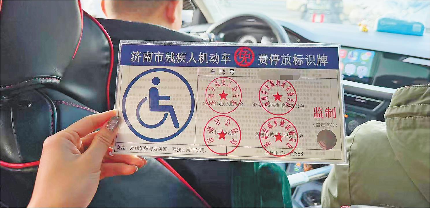 小刘一直随车携带的“济南市残疾人机动车免费停放标识牌”。
