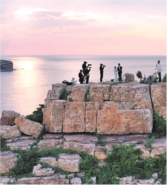 “不少客人以大黑山的蓝天、碧海、悬崖为背景,在这里举办海岛婚礼,去年我们接待旅拍客人4000组。”说着,郑凯掏出手机,翻出目的地婚礼的视频给记者看。