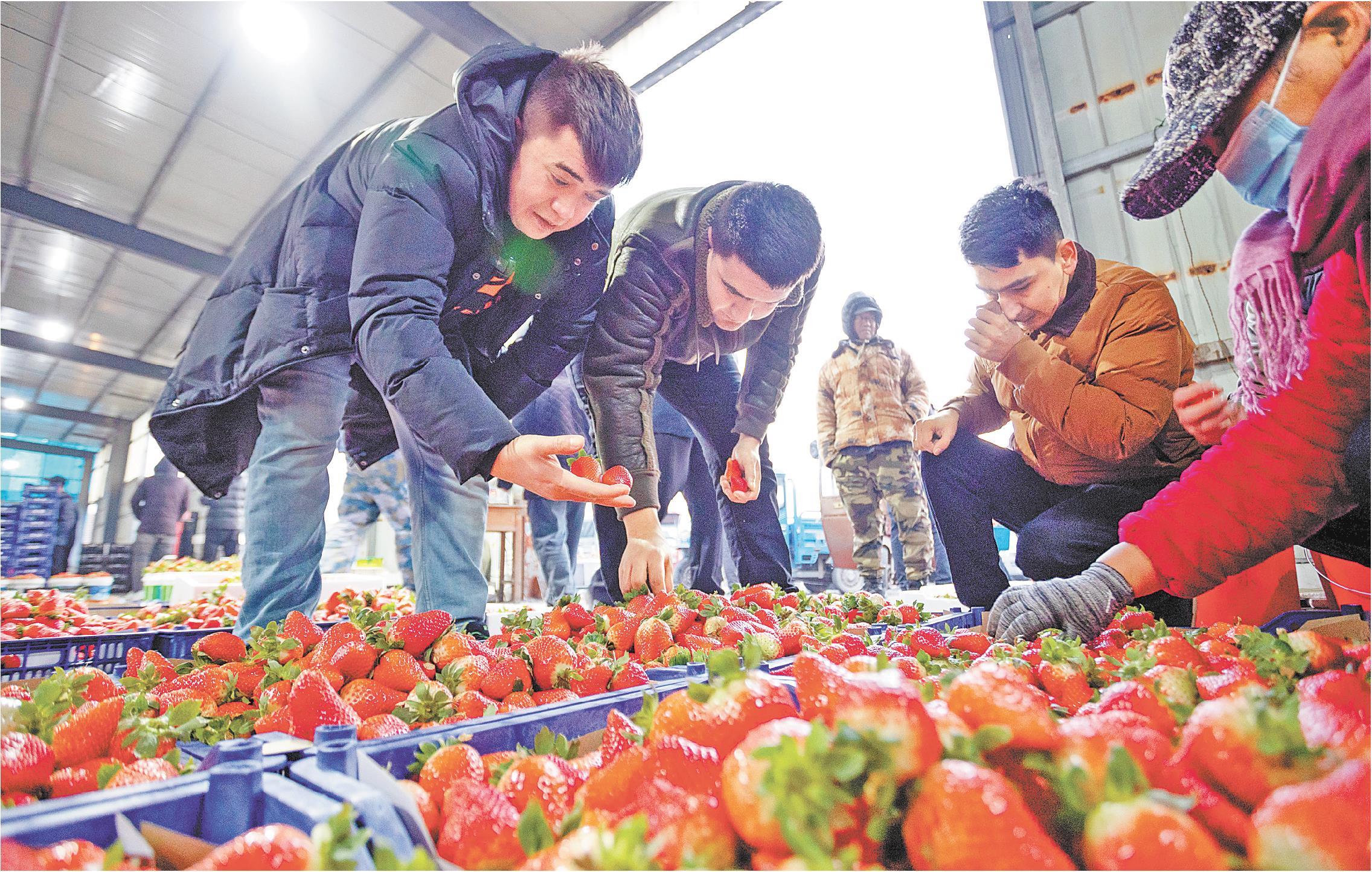进入草莓采摘季,每天5点多天不亮,莒南县道口镇胡家官庄村的草莓交易市场就已人声鼎沸。草莓种植户开着载满新鲜草莓的车辆往来运送。来自新疆的客商每天都来市场采购草莓,一部分供应新疆当地市场,一部分则会出口到俄罗斯、乌兹别克斯坦等国家。