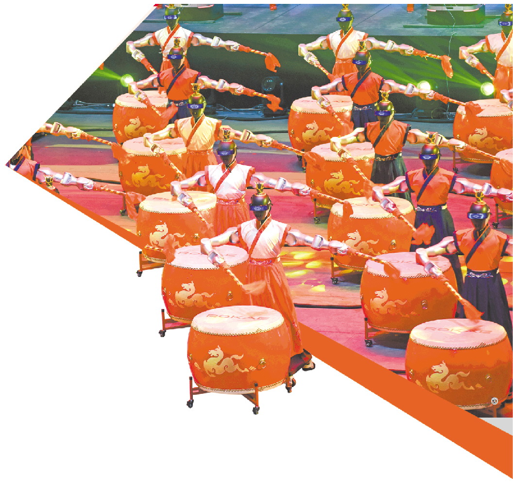 机器人春晚上,一阵急促而喜庆的鼓点响起,一排排珞石机器人“鼓手”整齐划一持槌挥臂,奏响万马奔腾之势。
