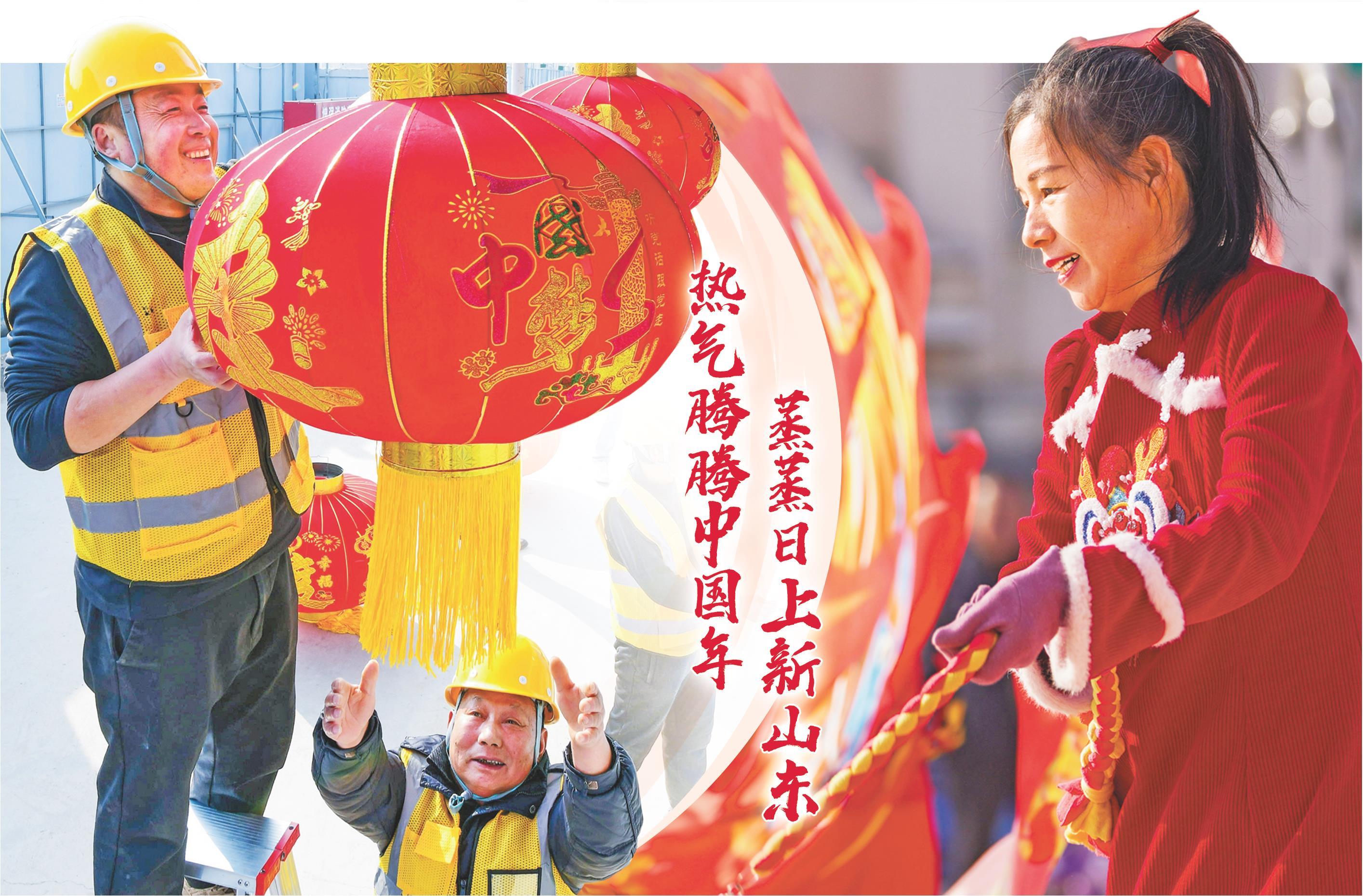 左图:2月13日,位于胶州市的上合示范区宋城演艺建设项目工地,工人们在生活区挂灯笼。(□通讯员 王昭脉 报道)