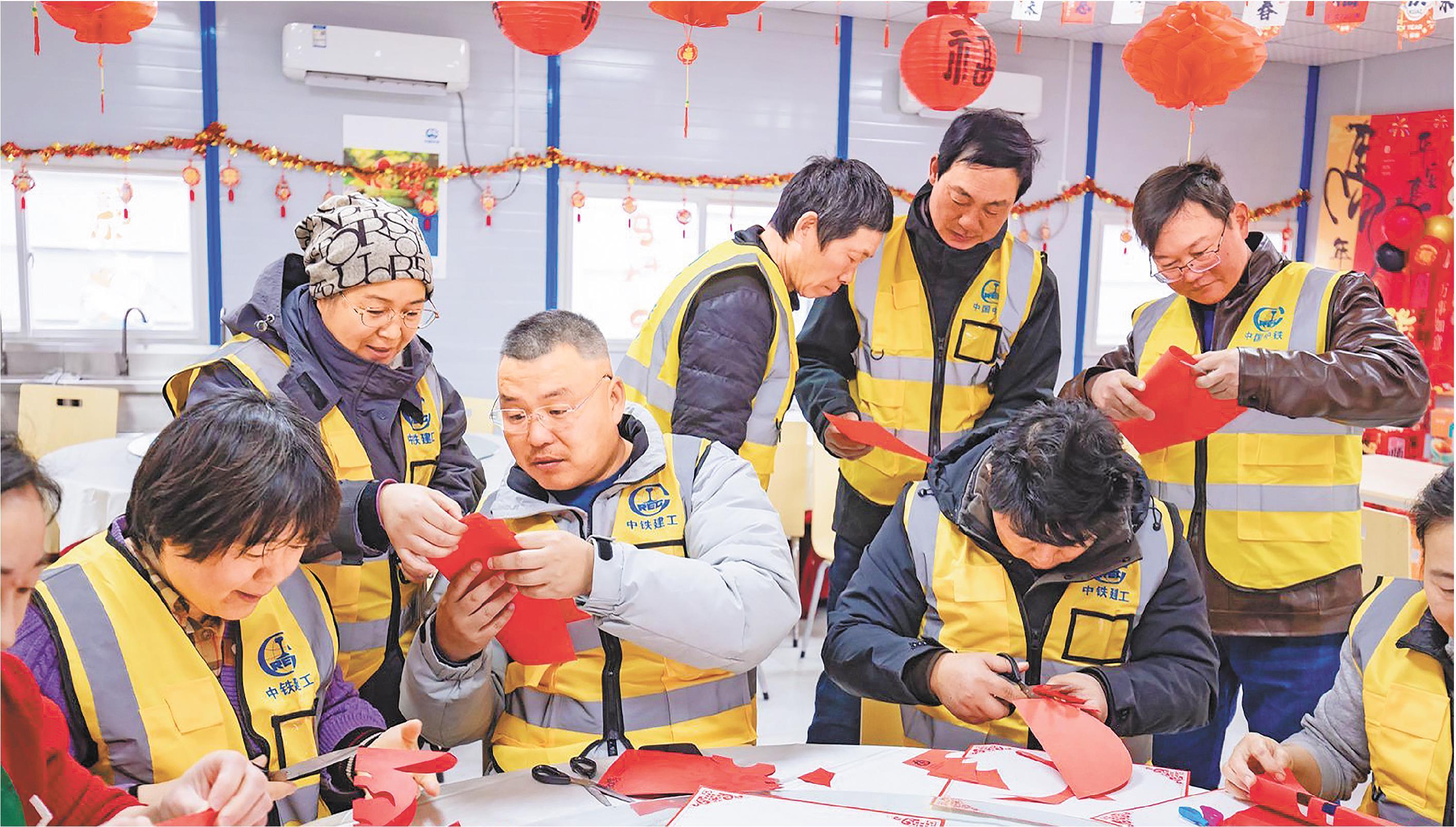 2月14日,中铁建工集团津潍高铁东营南站项目部,来自河南、江苏、安徽等地方的工友齐聚一堂,在齐鲁大地过上一个别样团圆年。(□记者 张晓帆 报道)