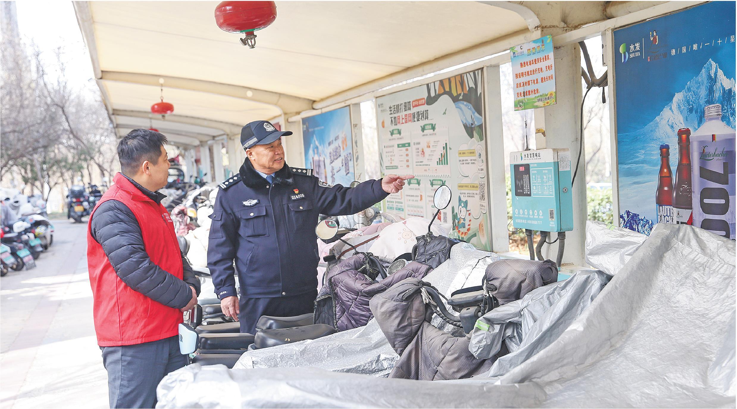 2月16日,济南市公安局市中分局十六里河派出所社区民警陈兴珍(右)与志愿者对小区电动车充电站进行安全检查。(□新华社发)