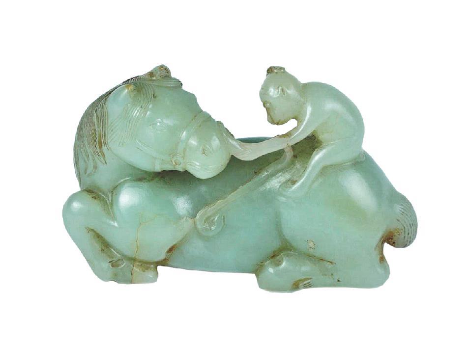 这件文物以青玉为料,长8厘米、宽3.3厘米、高5.5厘米。运用圆雕技法,雕出卧马回首的姿态,马背之上,一只灵猴伫立。骏马膘壮健美,鬃毛披散颈间,马首络头纹饰细腻。灵猴身形小巧,左臂轻抚马嘴,右手摩挲头顶,面部褶皱清晰可辨。玉质纯净无瑕,刀工精雕细琢,无一丝冗余。
