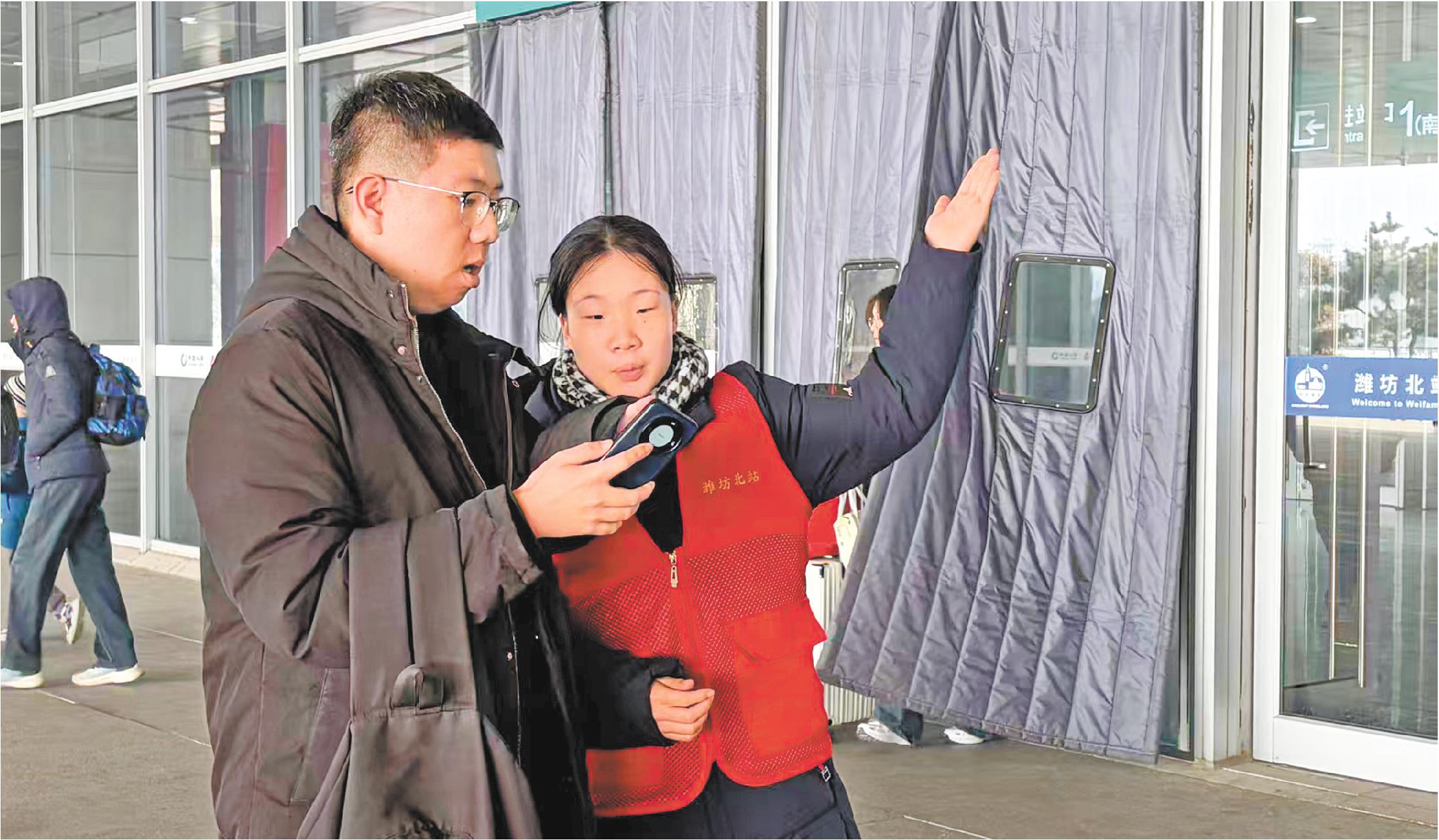 在潍坊北站出站口广场,志愿者为出站旅客指引方向,帮助旅客快速找到换乘通道,提升旅客出站效率。