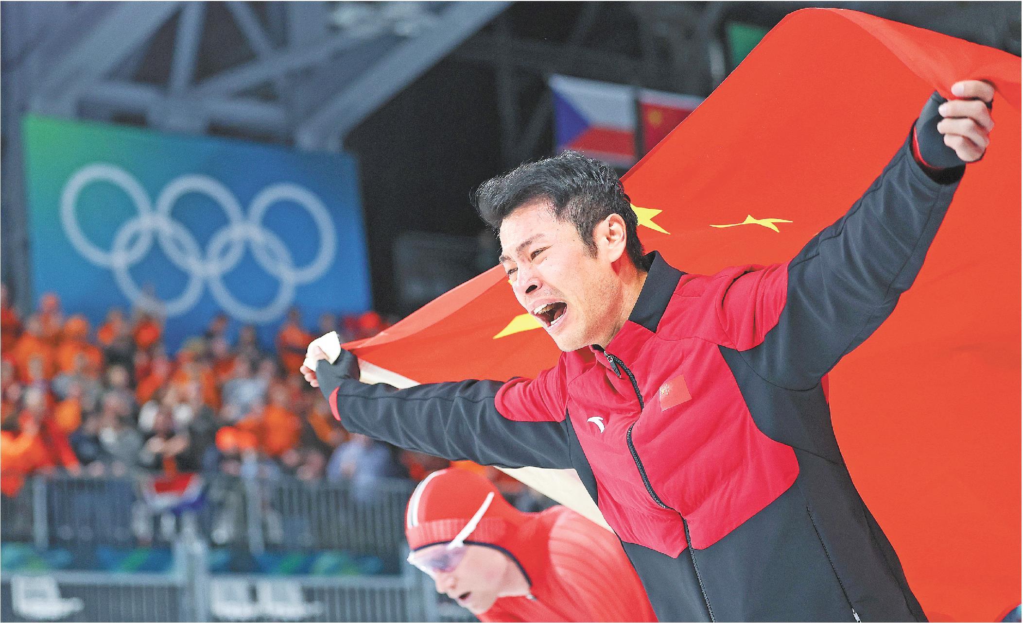 2月19日,宁忠岩在赛后身披国旗庆祝。