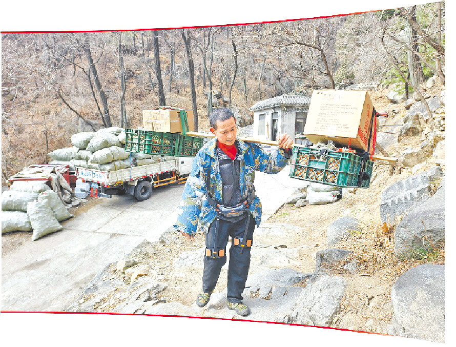 2月24日,王荣泉穿戴外骨骼登山助力设备在泰山上挑货物。