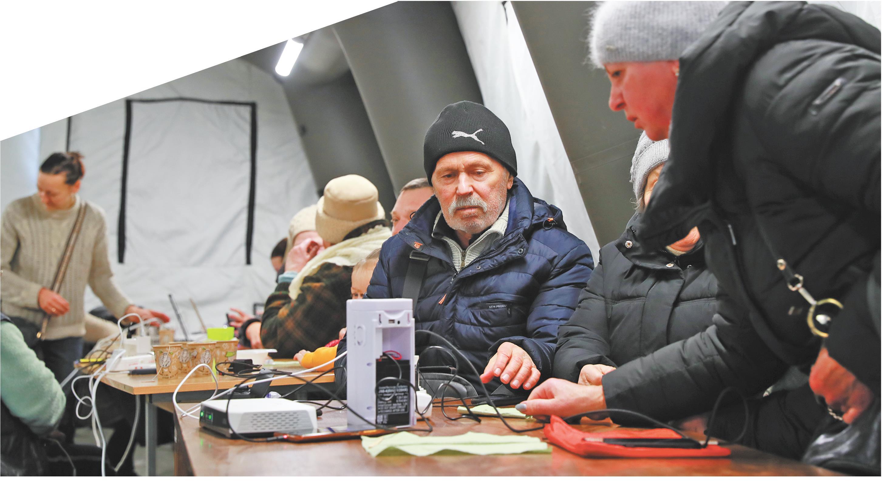 1月20日,人们在乌克兰基辅市一处应急点给电子设备充电。(□新华社发)