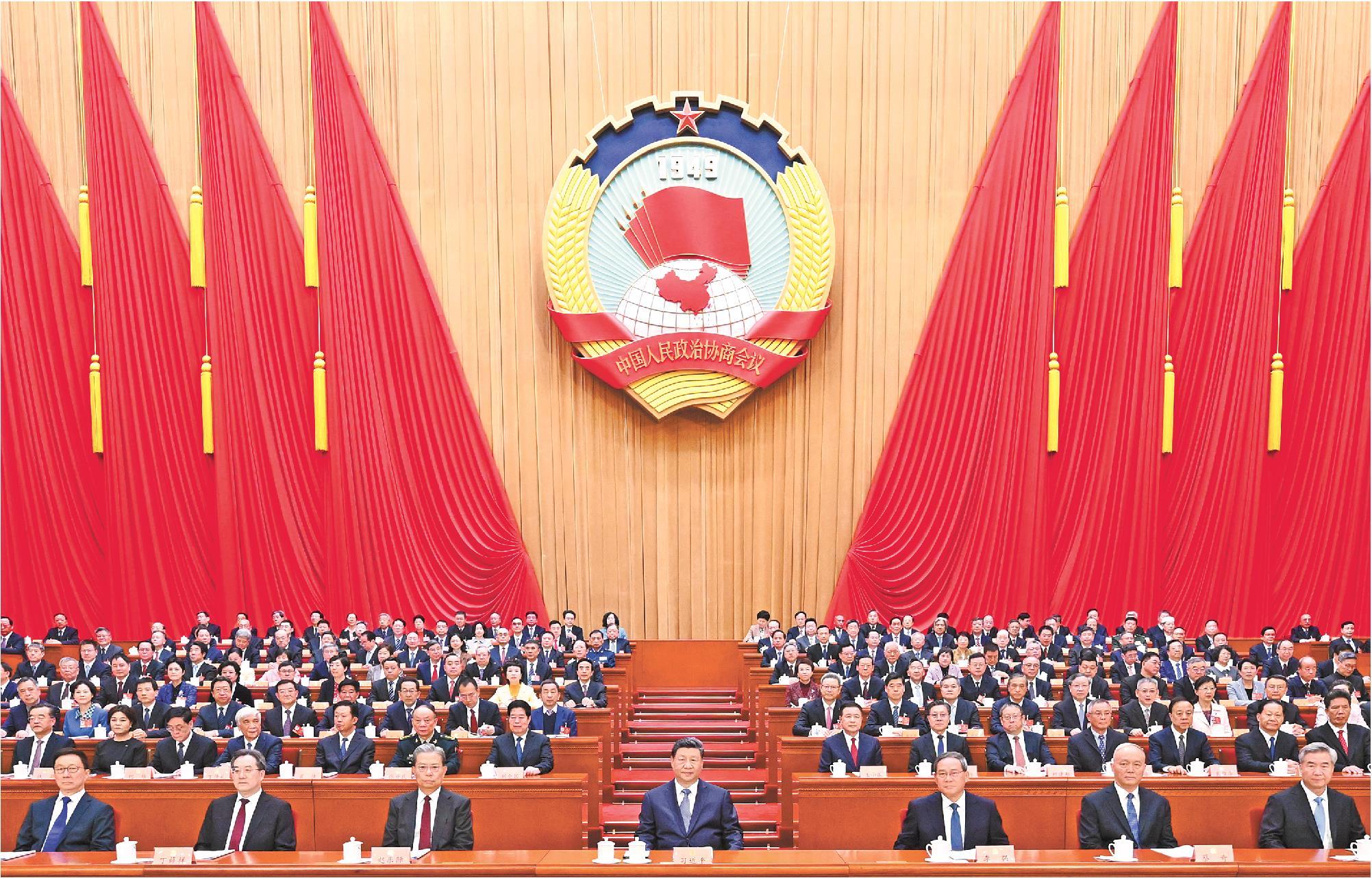 三月的北京,春启华章。人民大会堂大礼堂灯光璀璨,气氛隆重热烈。中国人民政治协商会议会徽悬挂在主席台正中,十面鲜艳的红旗分列两侧。