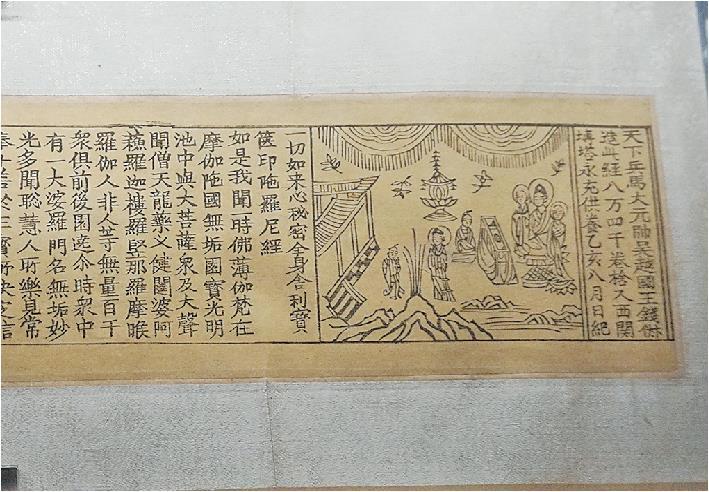 五代雕版印刷纸质《宝箧印陀罗尼经》,国家一级文物,现藏于济宁市博物馆。长495厘米、宽14.8厘米;卷芯长205.5厘米、宽8厘米,重113克。经卷用小竹签做轴心,卷成花爆状,裹以黄绢经袱,再用锦带束腰。经卷用棉纸印成,纸表细腻坚滑,字体偏方略扁,古雅拙朴近于魏碑。经文连前后题共271行,经卷正文开始每行10字,经文共2700余字,经卷版心狭而长,前为“礼佛图”。卷端题有“天下兵马大元帅吴越国王钱俶造此经八万四千卷,捨入西关砖塔,永充供养,乙亥八月日记”的字样。