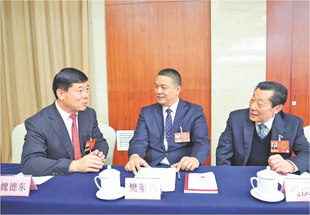 3月11日,住鲁全国人大代表魏德东(左起)、樊董伟、樊庆斌就加强体育、美育、劳动教育和心理健康教育,促进学生身心健康、全面发展建言献策。
