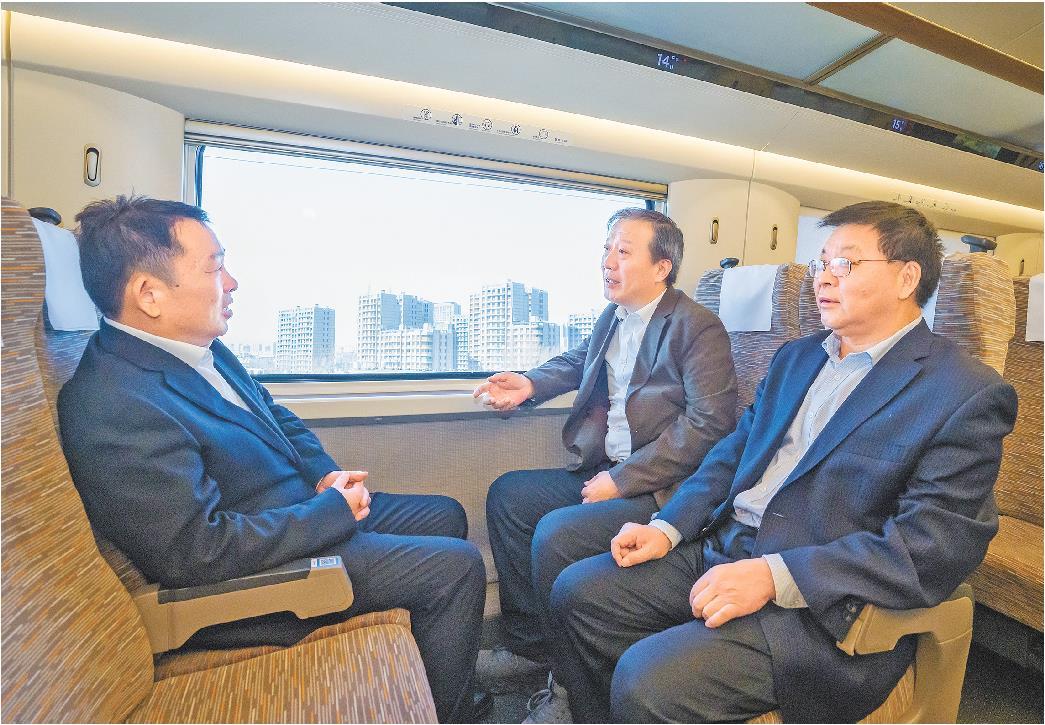 3月11日,住鲁全国政协委员王效彤(左起)、魏新、陈增敬在返回山东的高铁上,谈感受、说打算、话履职。