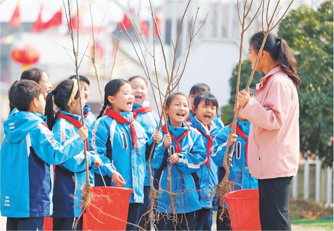 3月11日,临沂市郯城县第三实验小学的老师带领学生准备植树。