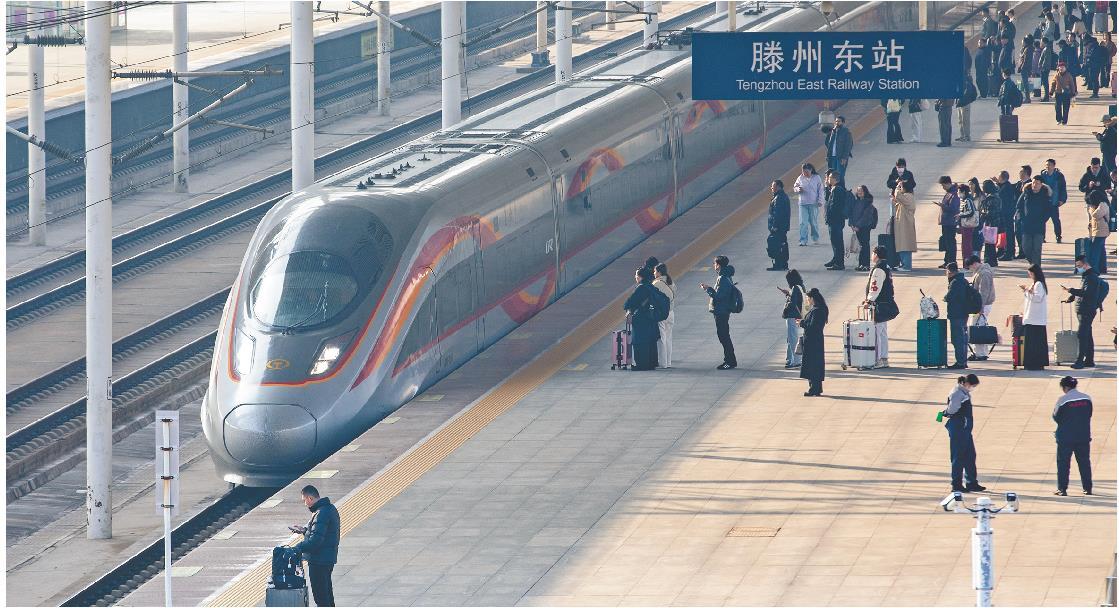 3月13日,为期40天的春运正式落下帷幕。图为滕州东站,高铁列车进站,旅客排队等车。(□记者 卢鹏 通讯员 孙杨 报道)