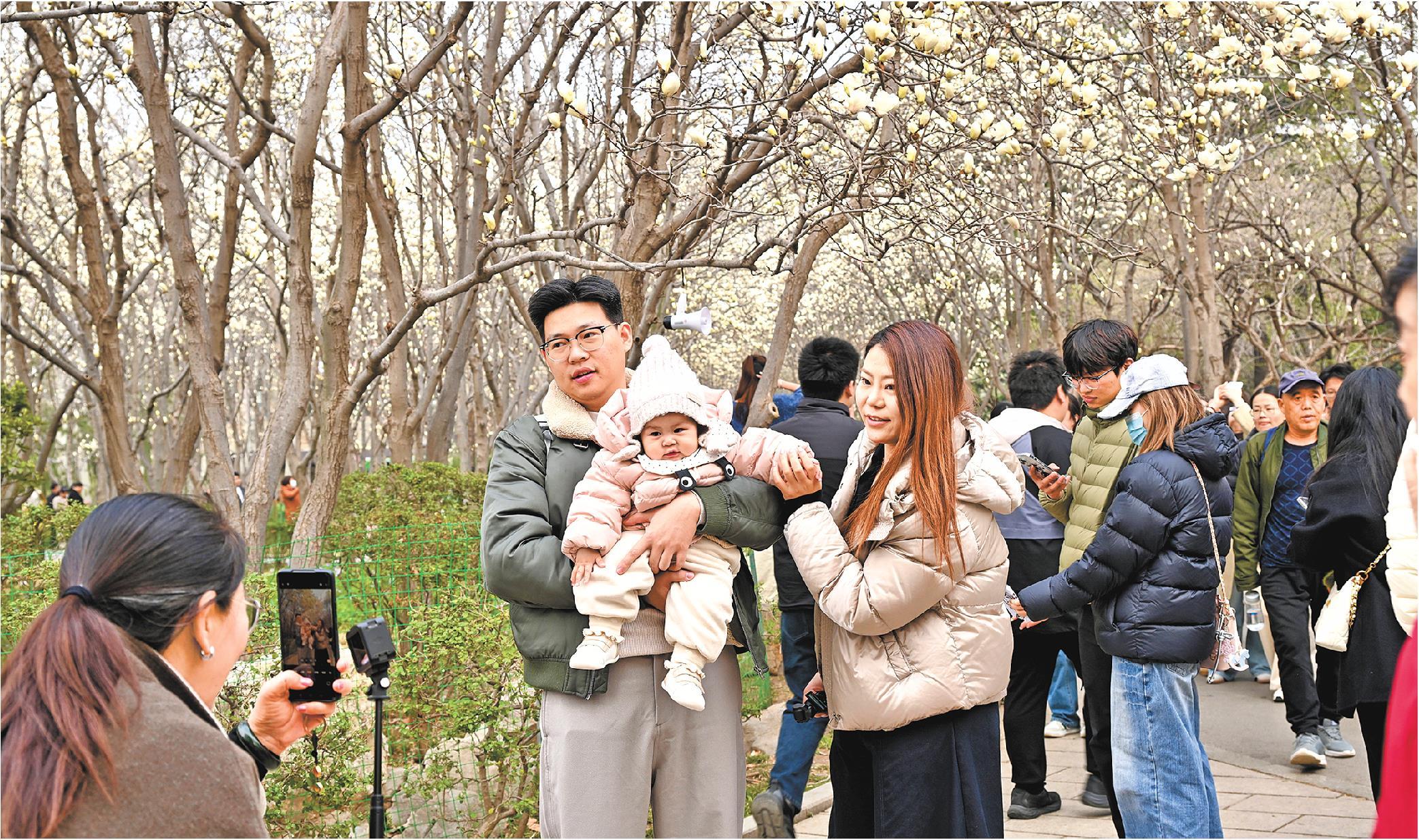 春分临近,气温回升,百花盛开。3月16日,济南百花公园,玉兰、美人梅、连翘等花开灿烂,粉白嫣红交织成画,吸引市民游客打卡拍照、乐享春光。