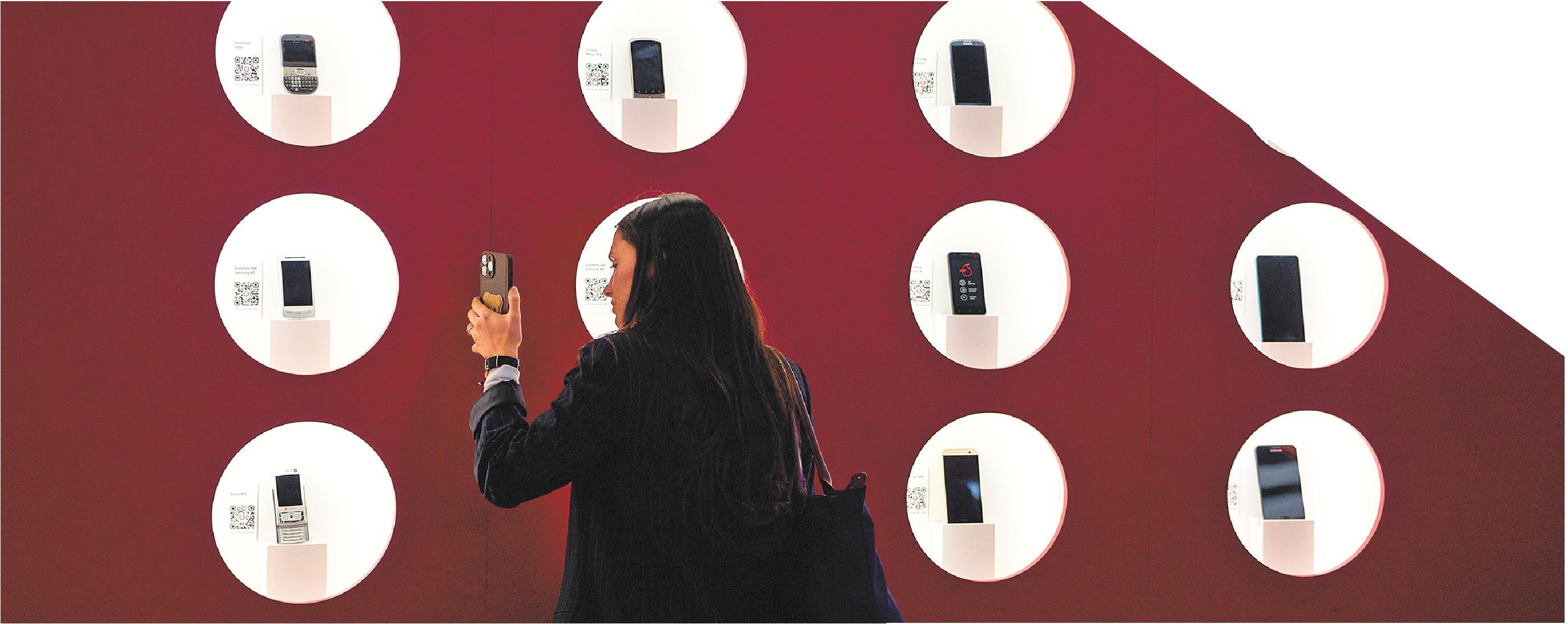 3月2日,在西班牙巴塞罗那举行的2026年世界移动通信大会上,参观者拍摄展出的手机。(□新华社发)