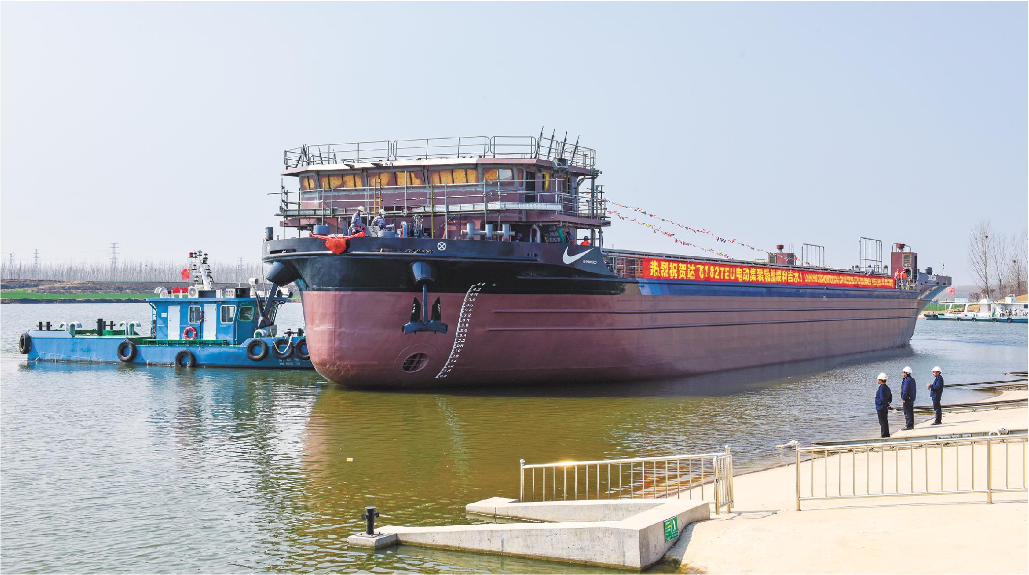 国产首艘出口纯电动力内河集装箱运输船在邹城下水