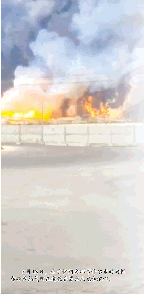 3月18日,位于伊朗南部布什尔市的南帕尔斯天然气田在遭袭后冒出火光和浓烟。