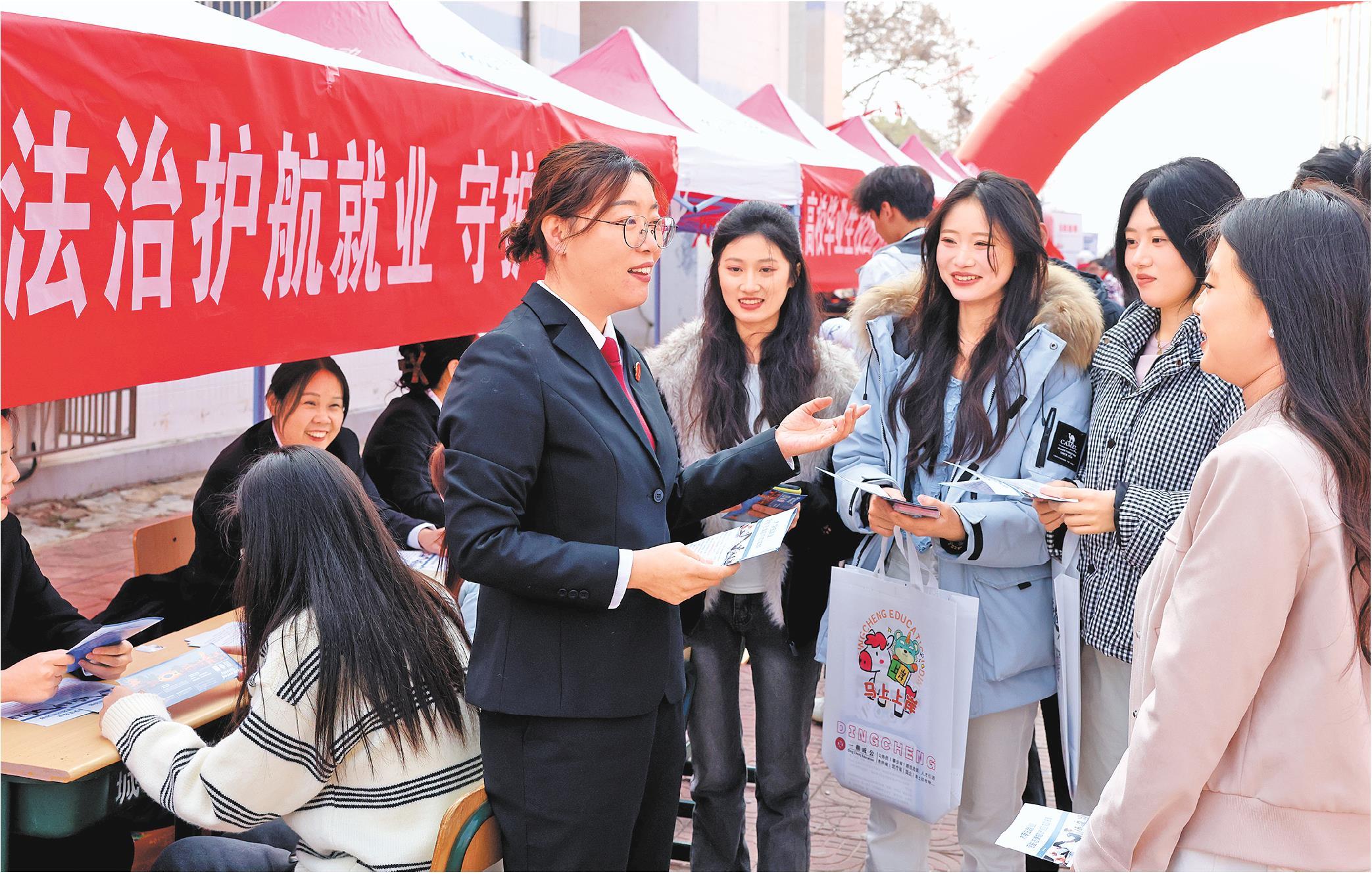 同时,枣庄市人社局、法院、工会等单位工作人员现场为求职大学生提供就业指导服务,助力高校毕业生就业。图为枣庄市市中区人民法院法官向求职大学生宣讲劳动用工相关法律法规。