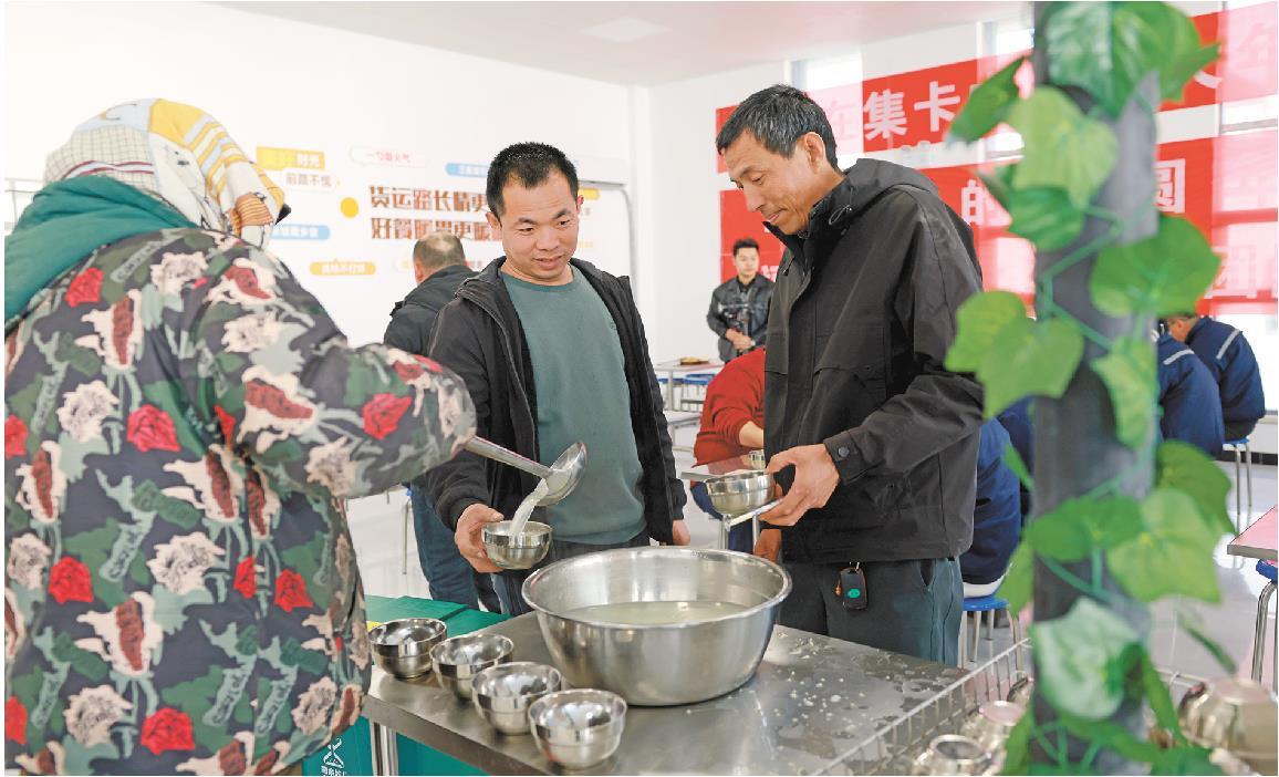 3月11日中午,王启龙(中)在青岛西海岸新区开投集卡中心餐厅就餐,在这里,15元就能吃到一顿热乎饭。