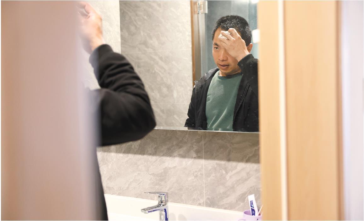 下午2点,王启龙在青岛西海岸新区开投集卡中心客房整理着装准备出发干活。