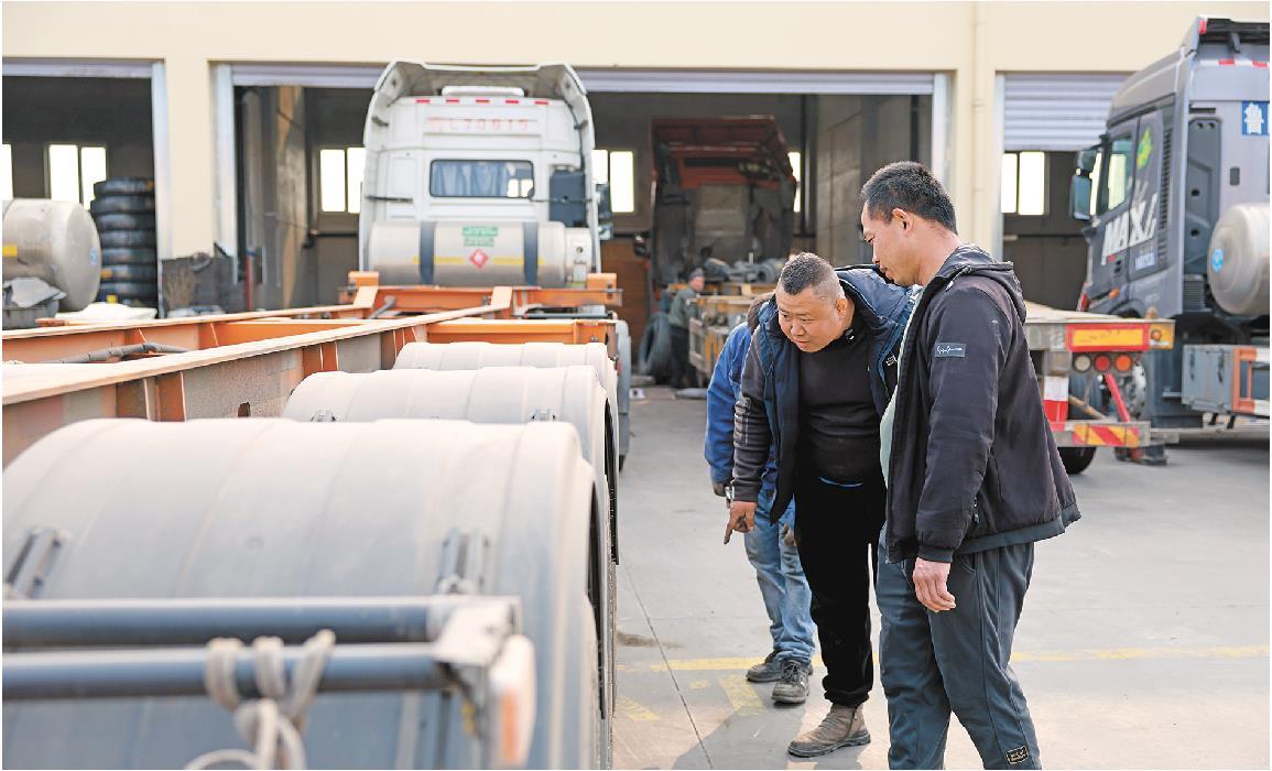 下午2点半,王启龙(右)在青岛西海岸新区开投集卡中心维修区对车辆进行安检。