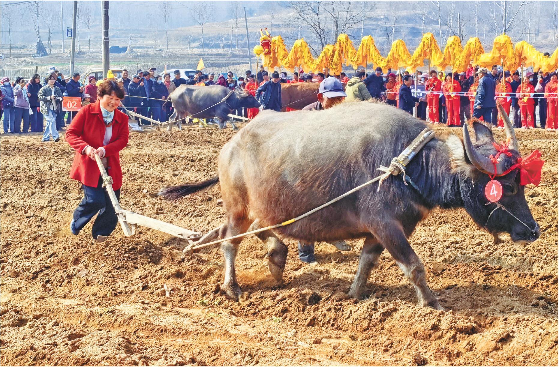 “咧咧,啦啦,吁……”在闹春牛耕牛比赛现场,78岁的庄会明喊起地道的使牛号子,耢耙耕作一气呵成。