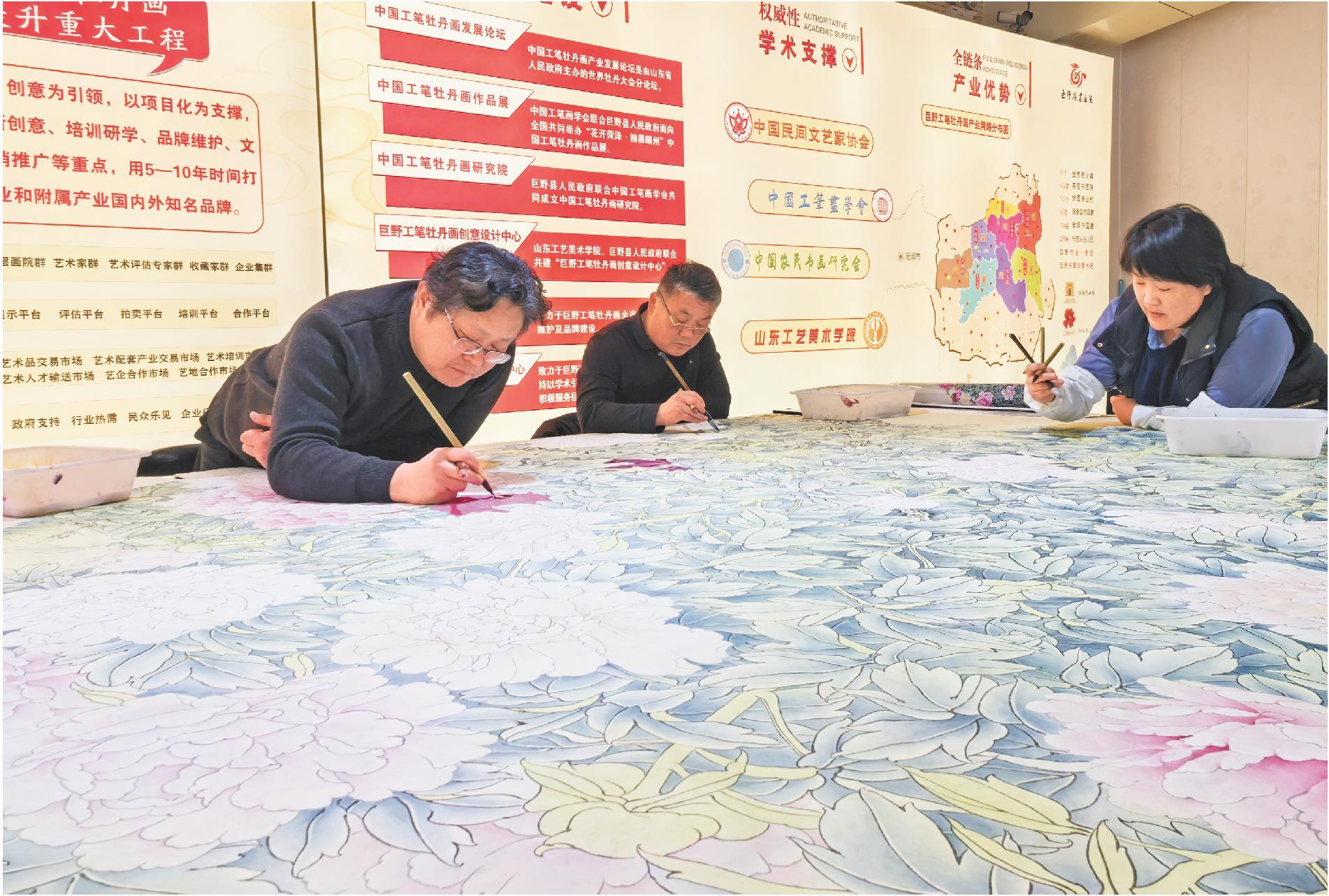 3月19日,在巨野县书画院,画师们在进行巨幅工笔牡丹画创作,迎接2026菏泽牡丹节会的开幕。