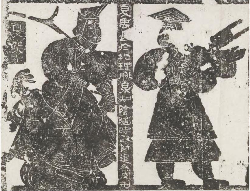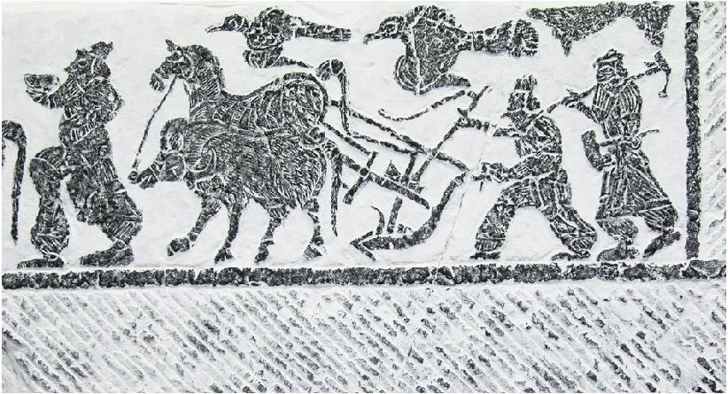 在山东济宁嘉祥县武氏墓群画像石中,有一幅三皇五帝等帝王的“集体照”,其中大禹石刻像是目前已知最早的大禹“形象照”。石刻中,大禹面左身右、头戴斗笠、左手平伸,右手拿一件类似杈的工具。这件工具既是治水利器,同时也是当时农业生产中的先进工具——耒耜。