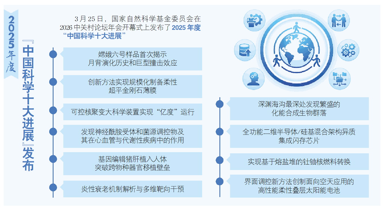 国家自然科学基金委发布2025年度“中国科学十大进展”,嫦娥六号样品首次揭示月背演化历史和巨型撞击效应、创新方法实现规模化制备柔性超平金刚石薄膜、可控核聚变大科学装置实现“亿度”运行……一批成果让世界瞩目。