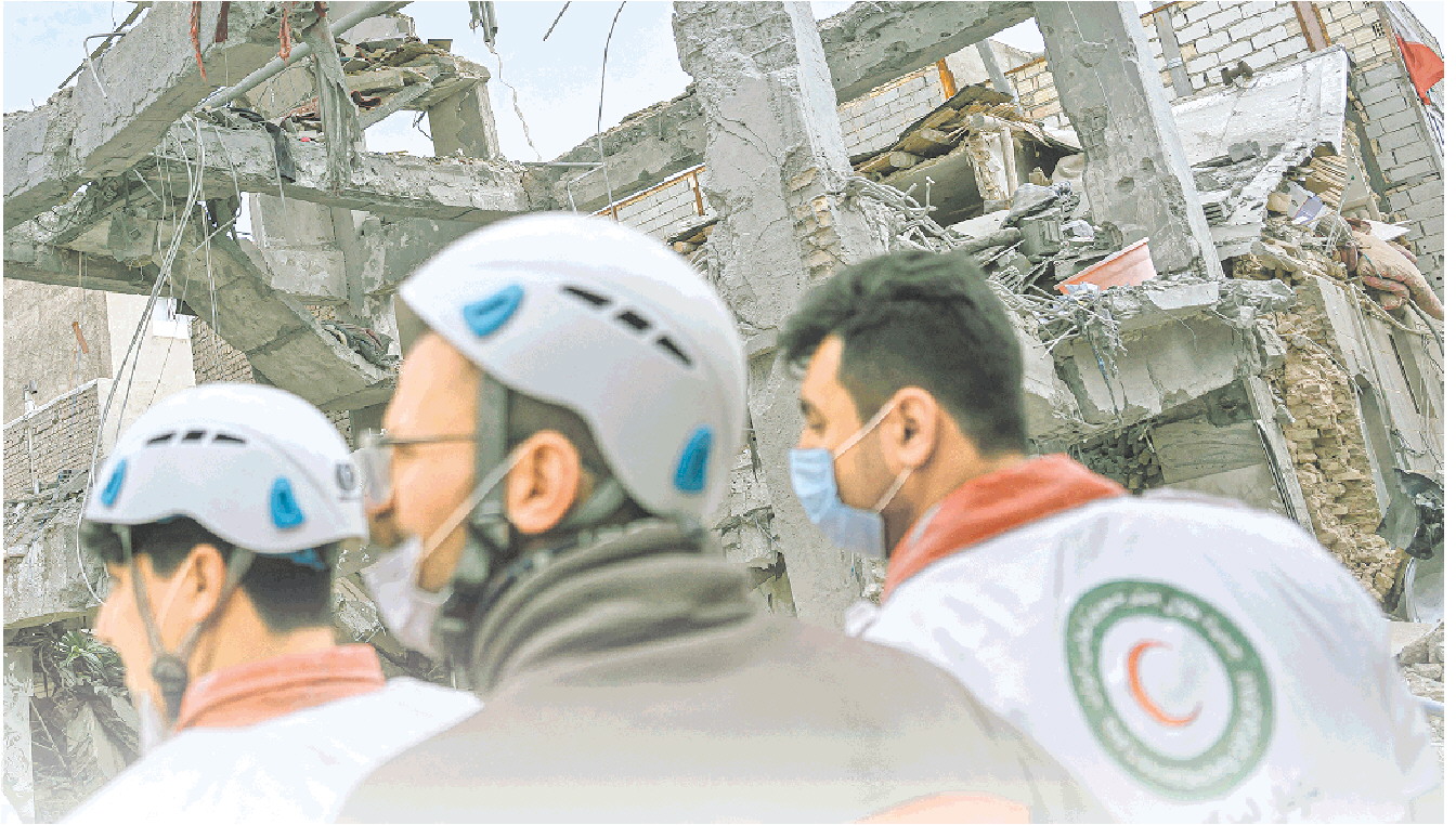 3月24日,在伊朗东阿塞拜疆省大不里士,救援人员在一处遭袭的住宅楼附近查看情况。(□新华社发)