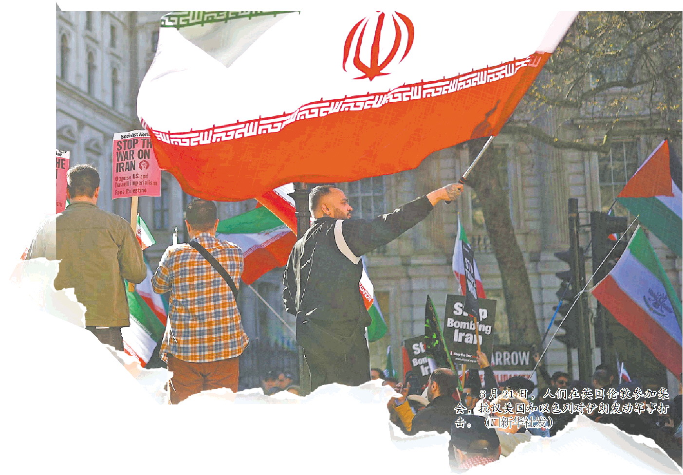 3月21日,人们在英国伦敦参加集会,抗议美国和以色列对伊朗发动军事打击。(□新华社发)