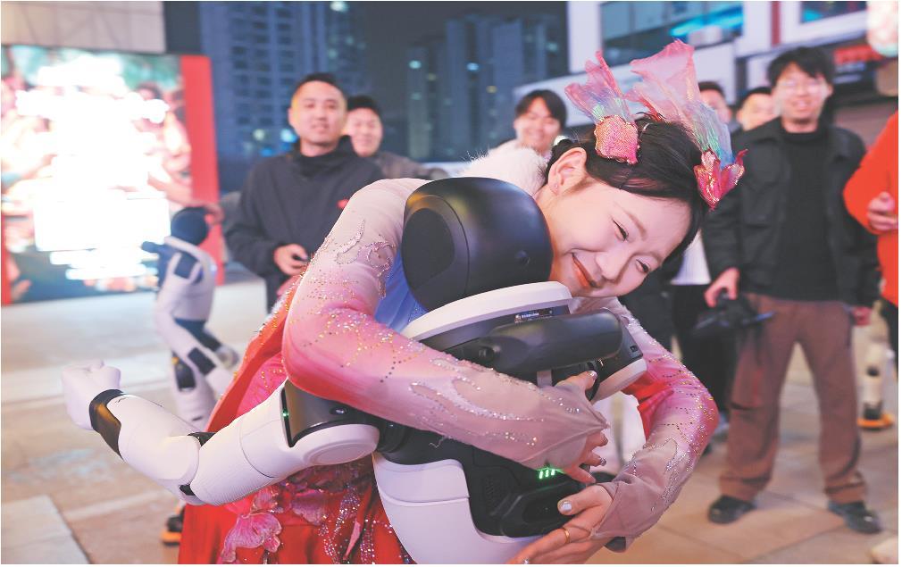 3月11日晚,临沂市兰山区水韵琅琊旅游区,人机配合的舞蹈演出后,舞蹈演员拥抱人形机器人,表示“感谢”。