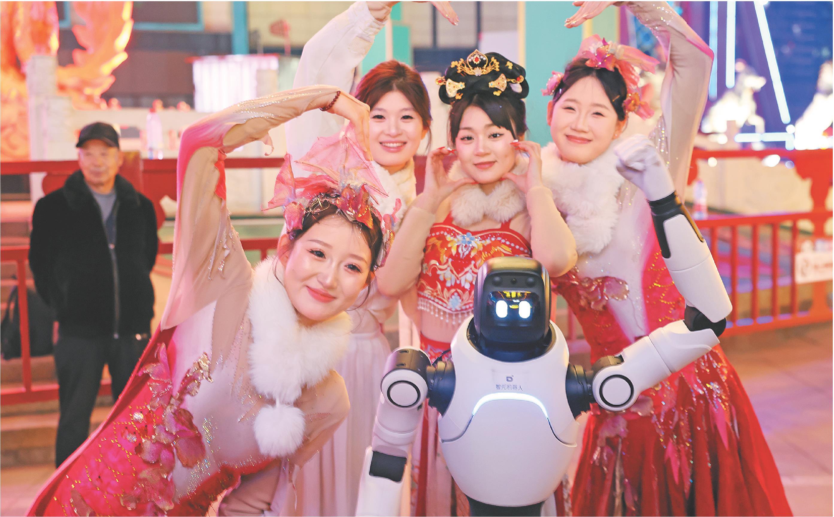 3月11日晚,在临沂市兰山区水韵琅琊旅游区的演出结束后,演员们与“团宠”机器人一起合影留念。