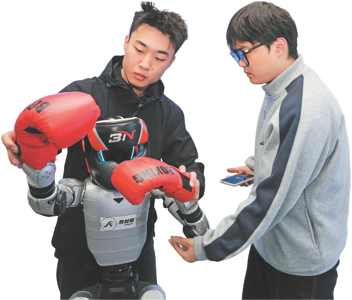 3月14日,在山东金锐公司办公室,技术人员将人形机器人装扮成拳击手,手把手“教”它拳击动作。