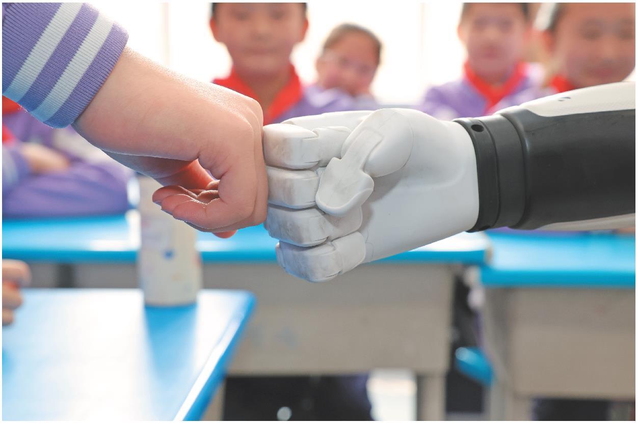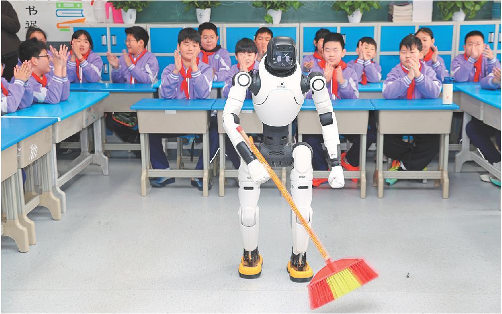 3月12日,在临沂第三实验小学教室里,人形机器人“拿着”扫帚扫地,向学生们展示未来人形机器人的实际应用场景。