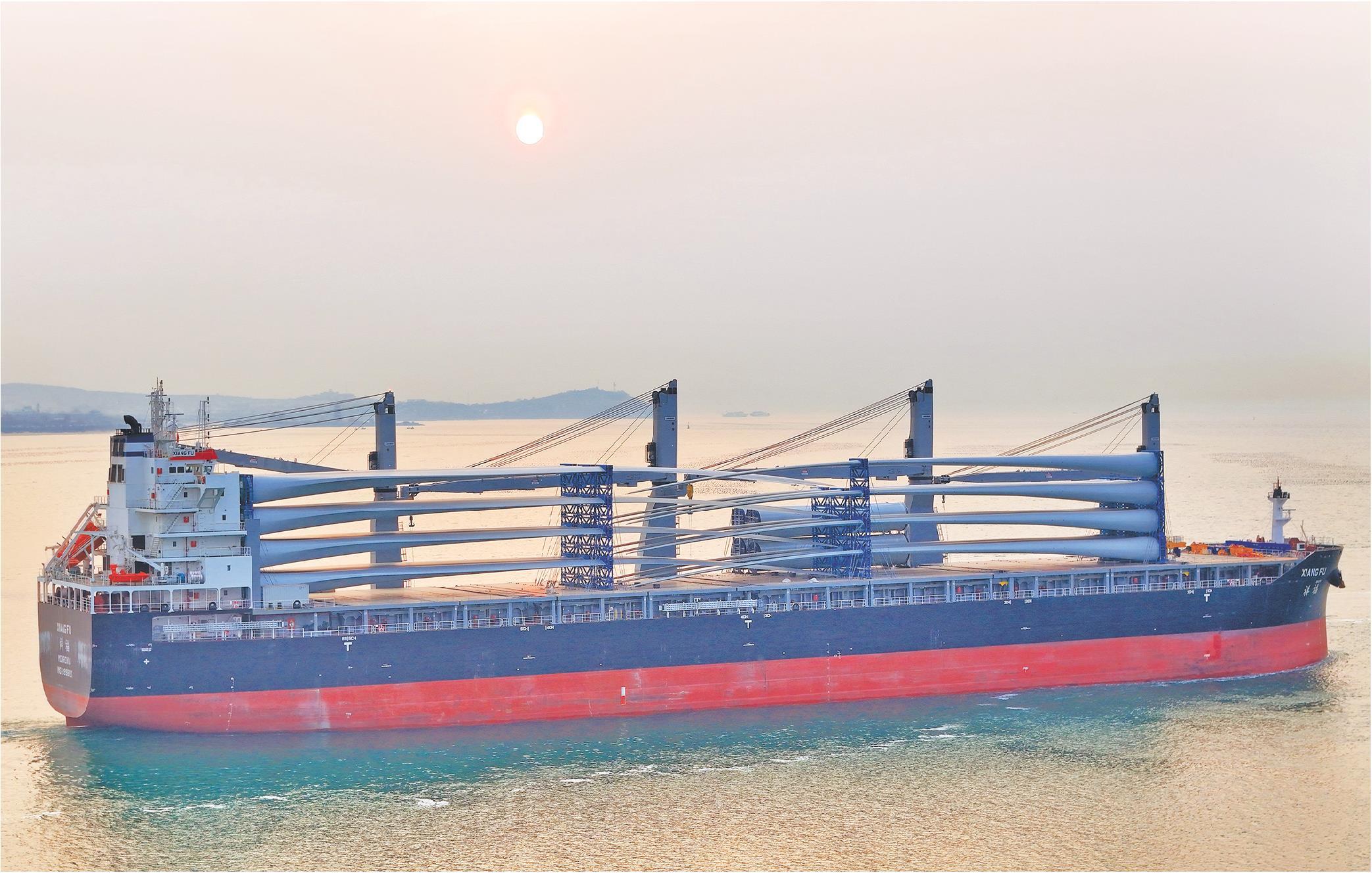 3月28日,装载着出口奥地利的风电设备的货轮从山东港口烟台港蓬莱港区起航。