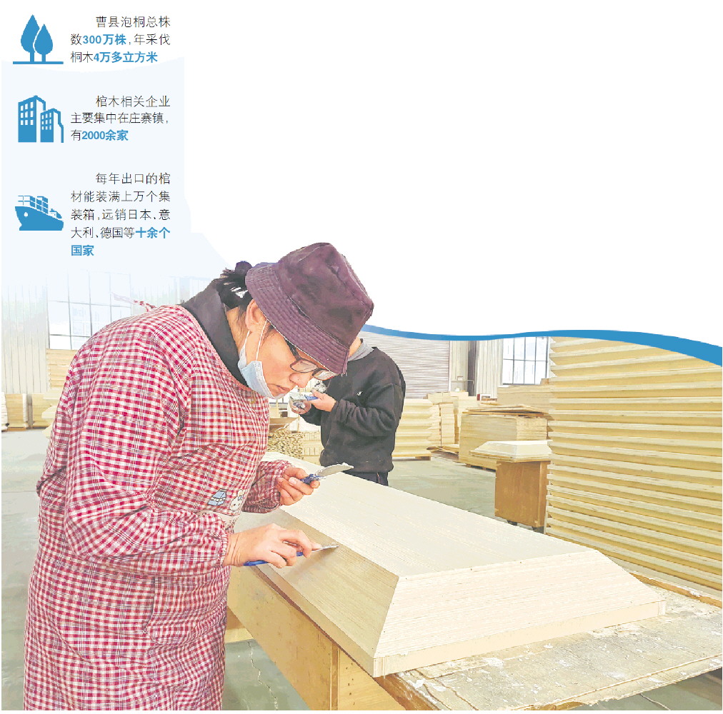 与我国隔海相望的日本长崎港,几乎每天都有来自中国的货轮靠岸,其中不少集装箱里装满了棺木。据统计,日本殡葬市场中,近九成棺木产自中国,其中曹县一地的产品占六成以上。可以说,曹县以当地优质泡桐为原料生产的棺木,已成为支撑日本殡葬行业运转的重要供应链条。