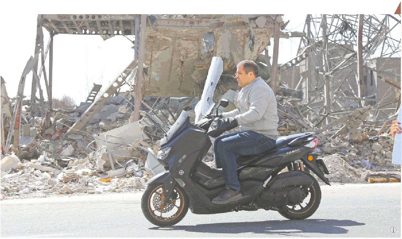 图①:3月4日,在伊朗首都德黑兰,一名男子骑车驶过建筑废墟。