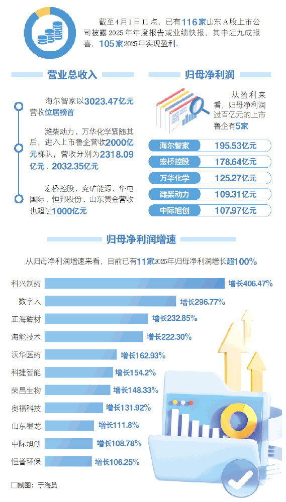 截至4月1日11点,已有116家山东A股上市公司披露2025年年度报告或业绩快报,其中近九成报喜,105家2025年实现盈利。这其中,有5家公司归母净利润突破百亿元大关,龙头企业盈利能力突出。
