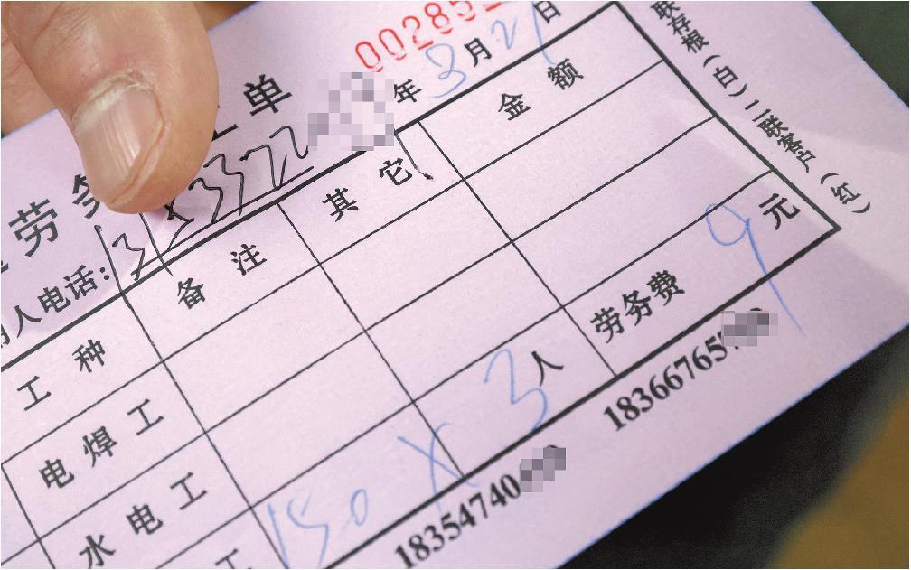 张宪娟收取每位工友5元劳务费,用工单位给每位工友再返还3元劳务费,相当于工友支付2元劳务费。图为3月27日,张宪娟开出的派工单,用工单位需要给三位工人支付459元的总费用。