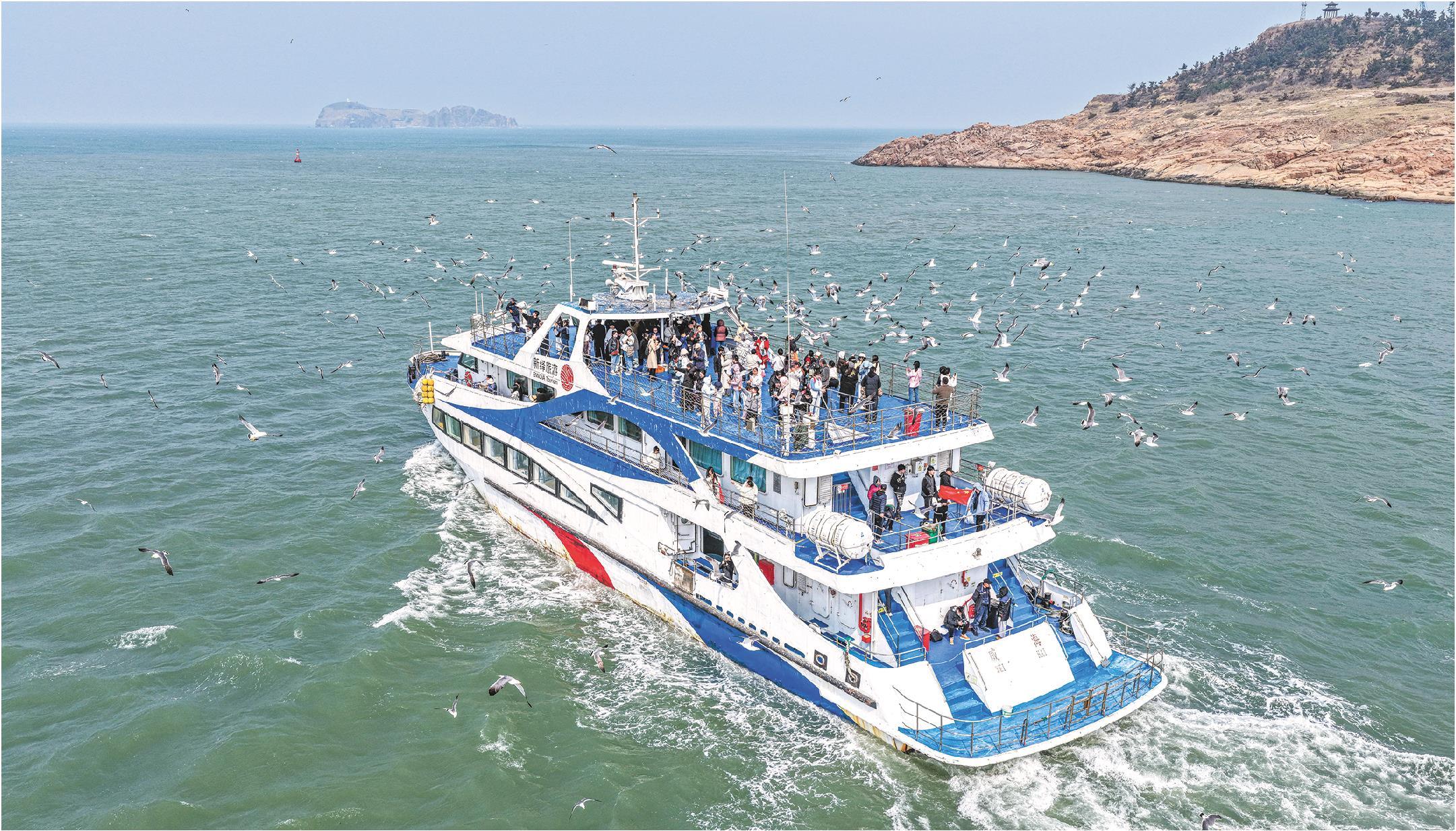 4月5日,在荣成市海驴岛海域,游客乘船出海,与成群黑尾鸥近距离互动打卡。