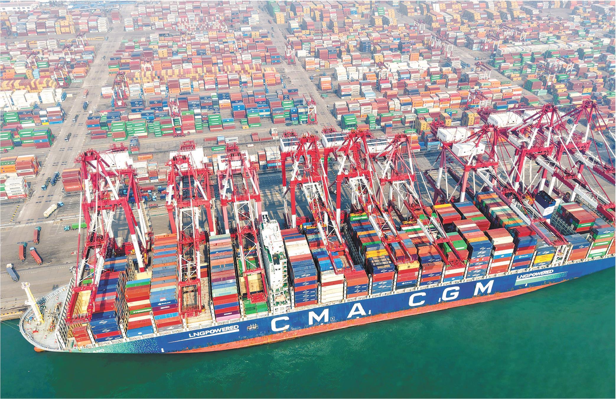 4月1日,货轮在山东港口青岛港装卸外贸集装箱。(□新华社发)