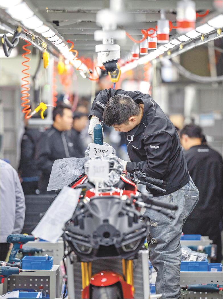 4月1日,工作人员在重庆两江新区“张雪机车”生产车间整车总装流水线上作业。