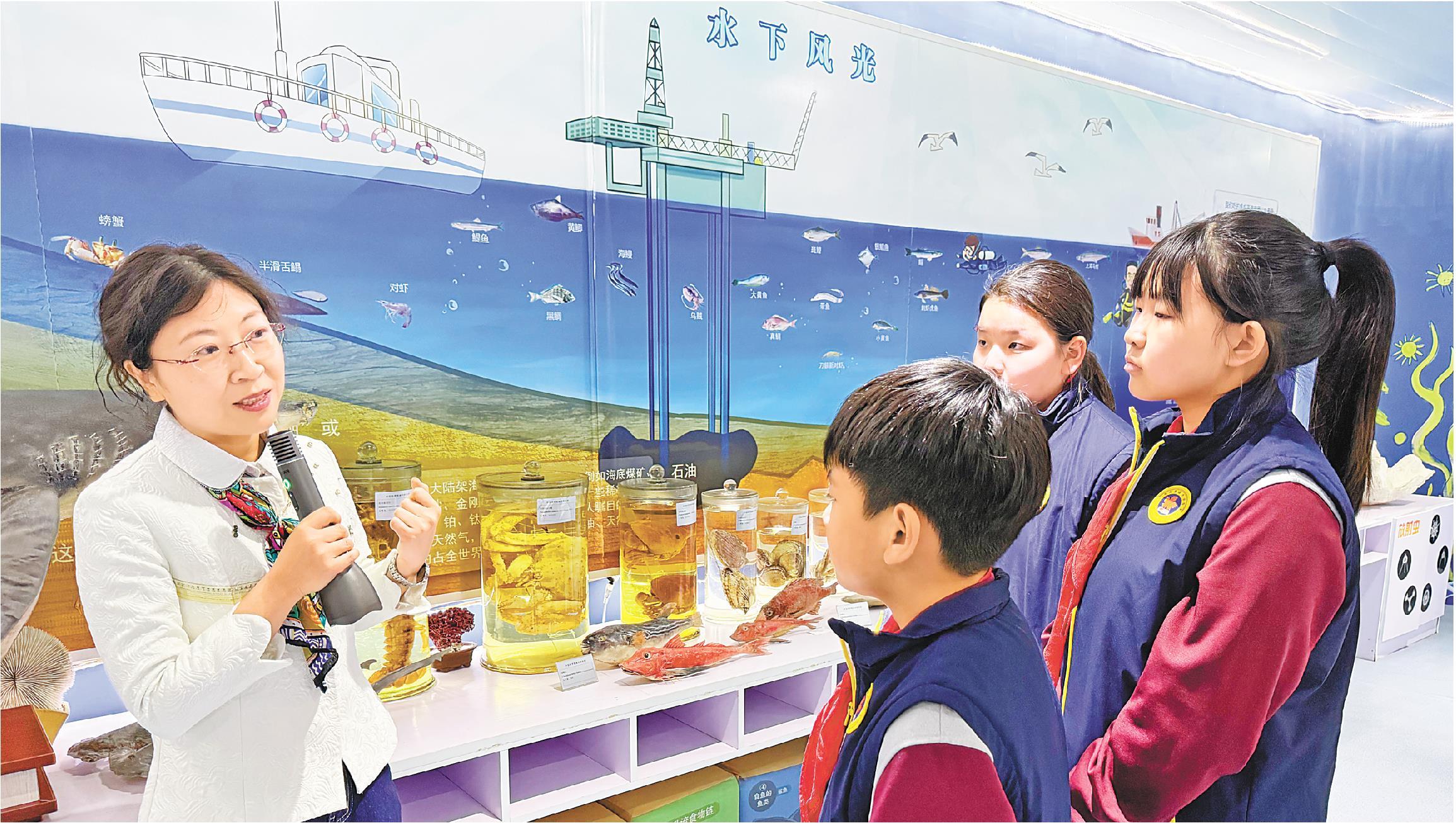 4月2日,在青岛嘉峪关学校海洋馆标本展示区,中国科学院海洋研究所郭琳博士(左一)向小学生讲解海洋标本知识。